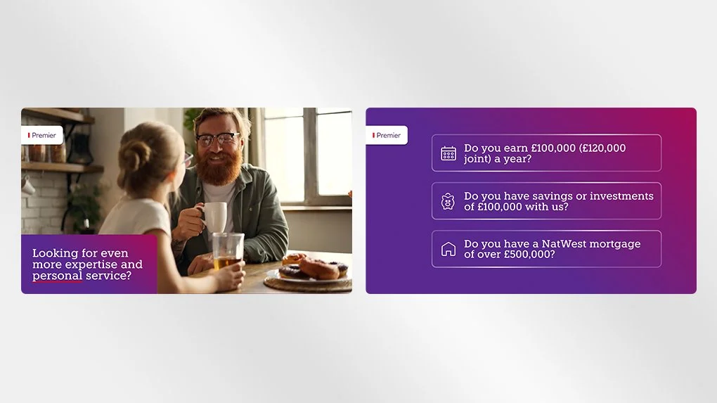 The deliverables included both product and service focused ads that made greater use of the NatWest pastel palette, addressing feedback that the purple screens were blending into branch interiors. This also involved redesigning the look and feel of Core and Premier Scala content, shifting towards full-bleed imagery, smaller typography and layouts better suited to in-branch screens rather than social channels. In addition, more playful, less sales-driven screen concepts were developed, with a stronger community focus to better engage customers while queuing or waiting in branch.